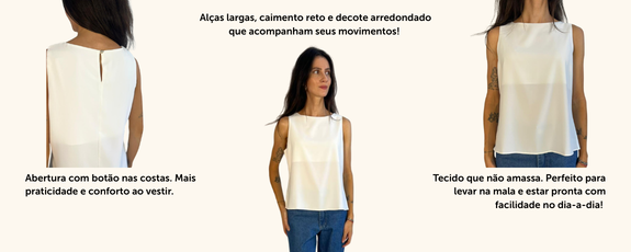 Perfeita para combinar com jeans, saias ou shorts, essa regata é essencial no guarda-roupa feminino. Aposte na simplicidade e estilo para criar produções modernas e descomplicadas.